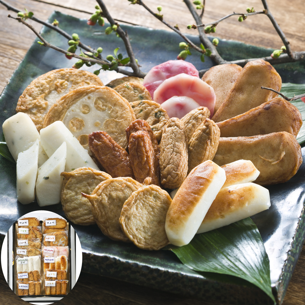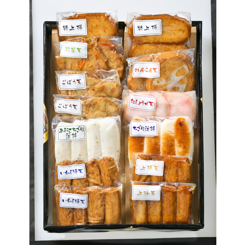 ■規格:野菜天×2、紅しょうが天×3、ごぼう天(3個)×2、特上揚(2個)×2、あおさちぎり蒲鉾×4、上棒天(4個)×2、ちぎり蒲鉾×4、れんこん天×2、いわし棒天(4個)×2