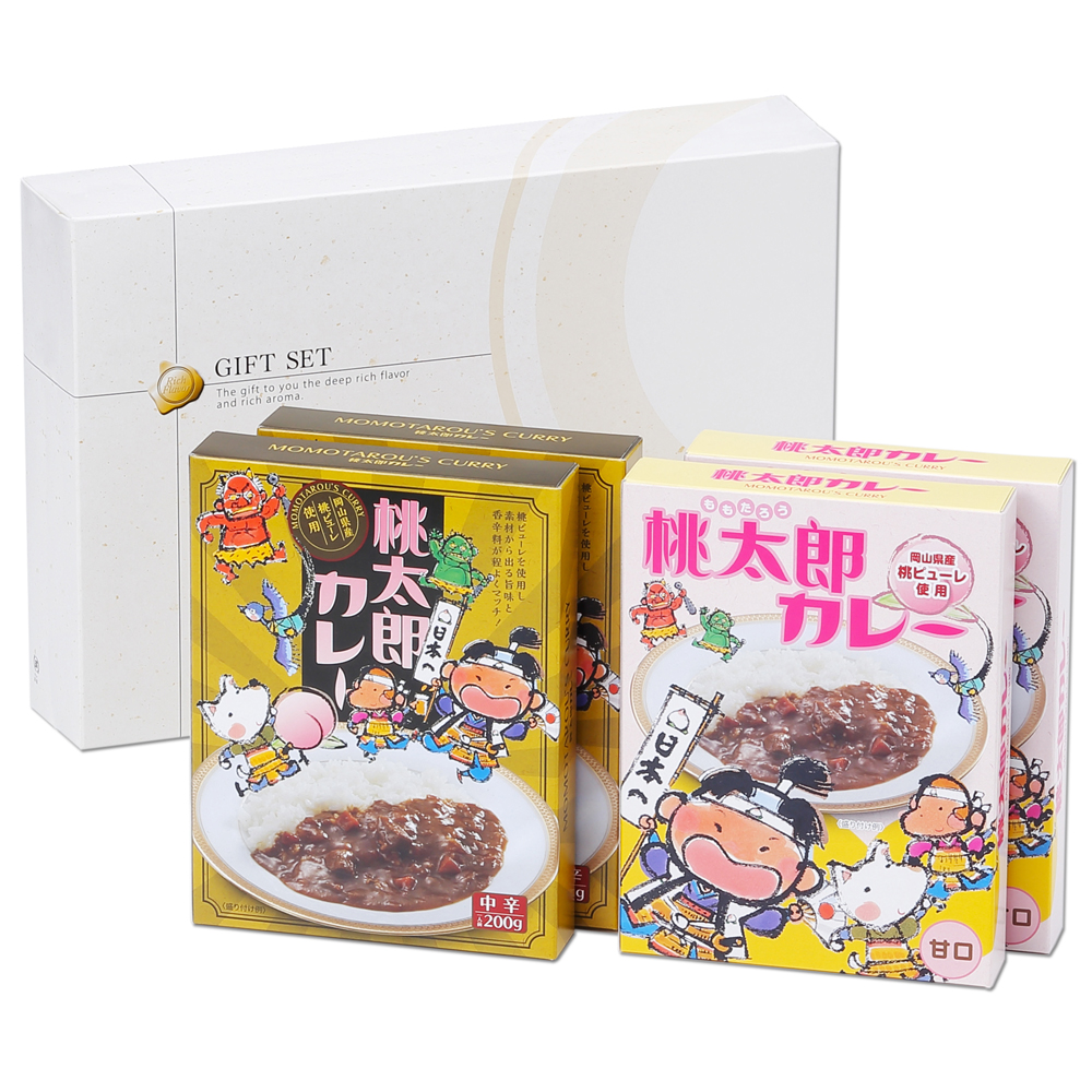 岡山県産の白桃を使用したカレーです。甘口と中辛の両方が楽しめるギフトにいたしました。