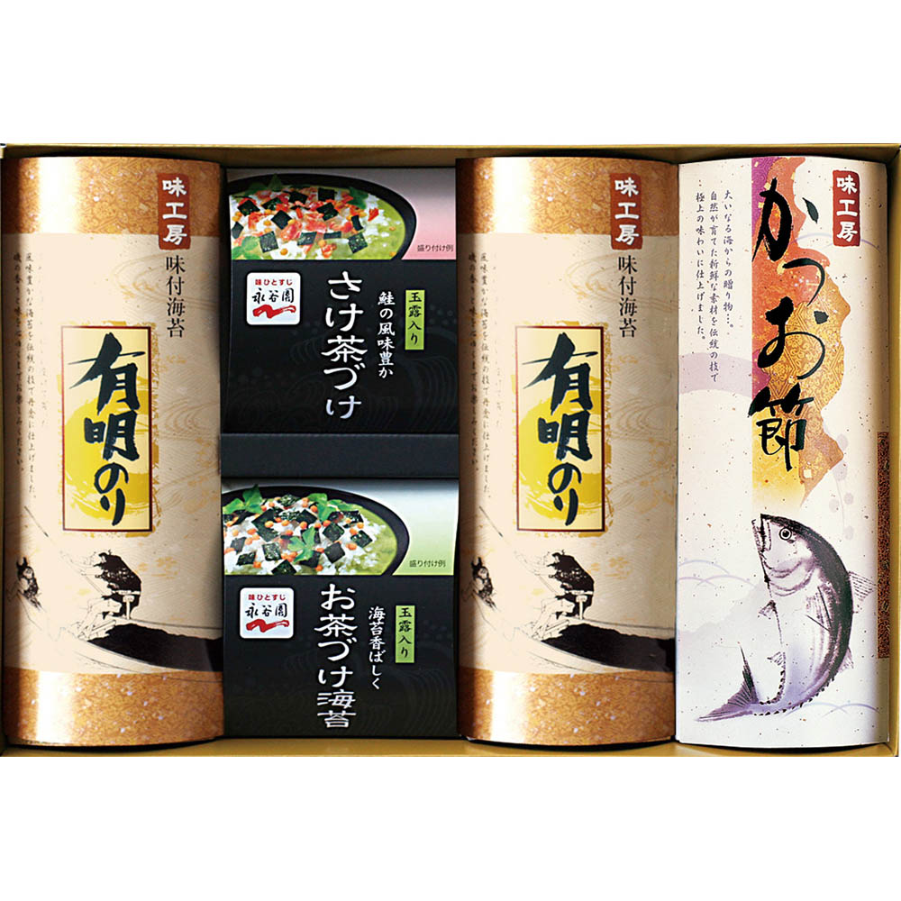 ■規格:永谷園さけ茶づけ5.6g×3、永谷園お茶づけ海苔6.3g×3、かつお節12g、有明のり(12切5枚6束)×4