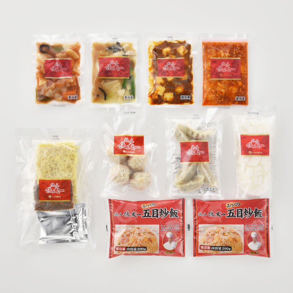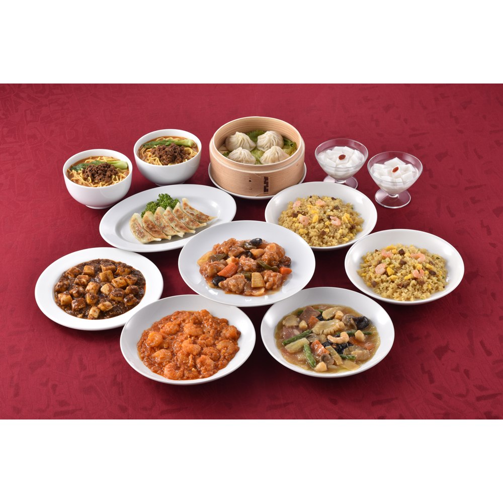 ■規格:餃子120g(6個入)×1、本格四川麻婆豆腐150g×1、乾焼蝦仁(エビチリソース)150g×1、本格八宝菜150g×1、酢豚150g×1、小籠包(4個入)140g×1、ふっくら五目炒飯(200g×2)×1、担々麺セット326g(麺200g、ごまだれ38g、液体スープ58g、ザージャン(肉みそ)30g入)×1、杏仁豆腐500g×1