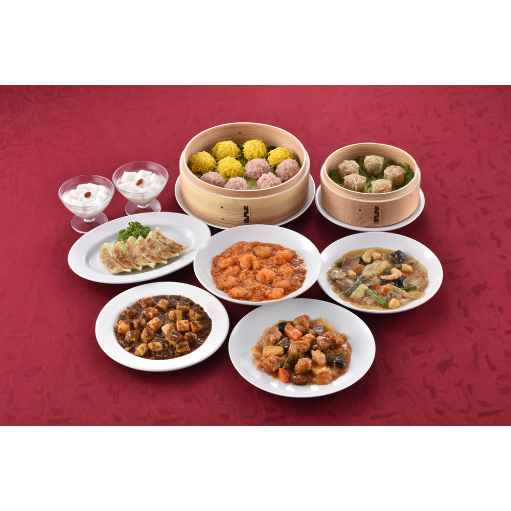 ■規格:餃子120g(6個入)×1、貝柱入焼売150g(5個入)×1、錦糸焼売125g(5個入)×1、珍珠丸子175g(5個入)×1、乾焼蝦仁(エビチリソース)150g×1、本格四川麻婆豆腐150g×1、本格八宝菜150g×1、酢豚150g×1、杏仁豆腐500g×1