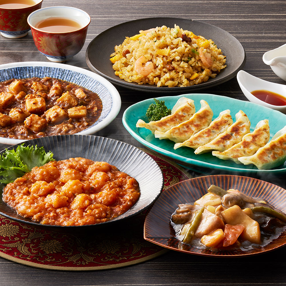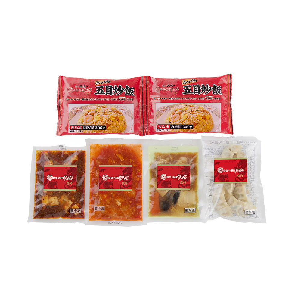 ■規格:乾焼蝦仁(エビチリソース)150g、四川麻婆豆腐150g、餃子120g(6個入)、ふっくら五目炒飯(200g×2)、本格八宝菜150g×各1