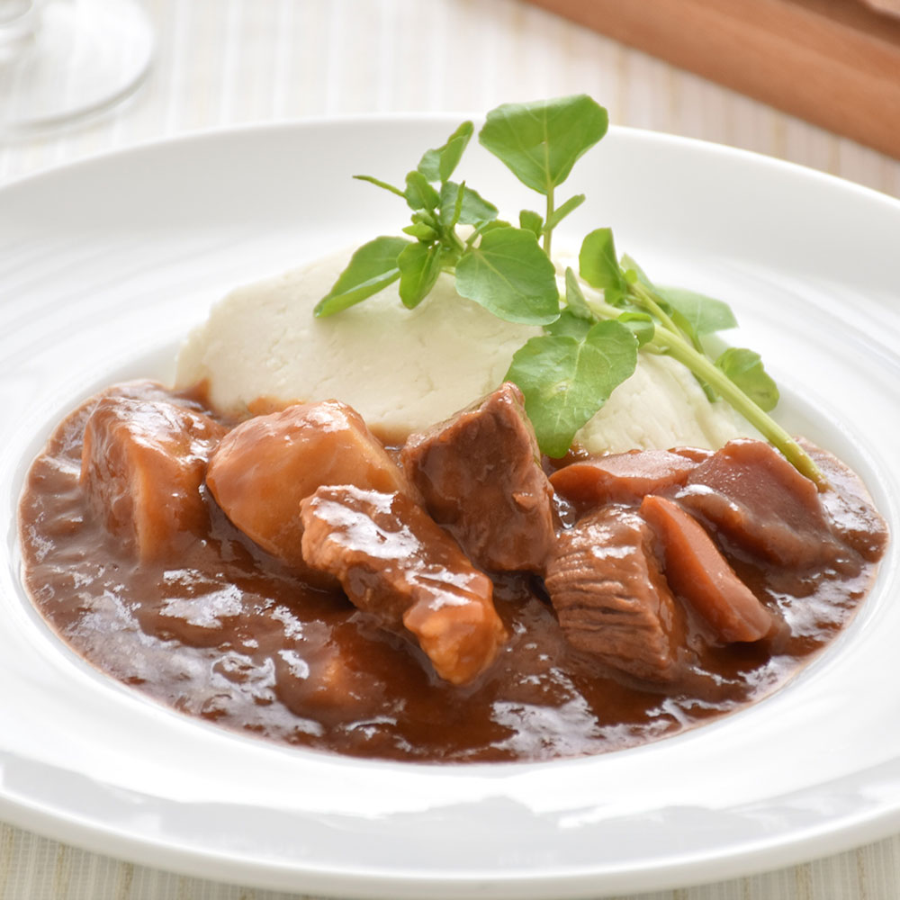 ソテーオニオンの旨味とトマトペーストの優しい酸味や赤ワインの風味が引き立てるソースに、大き目にカットした具材を合わせた奥深い味わいのビーフシチューです。