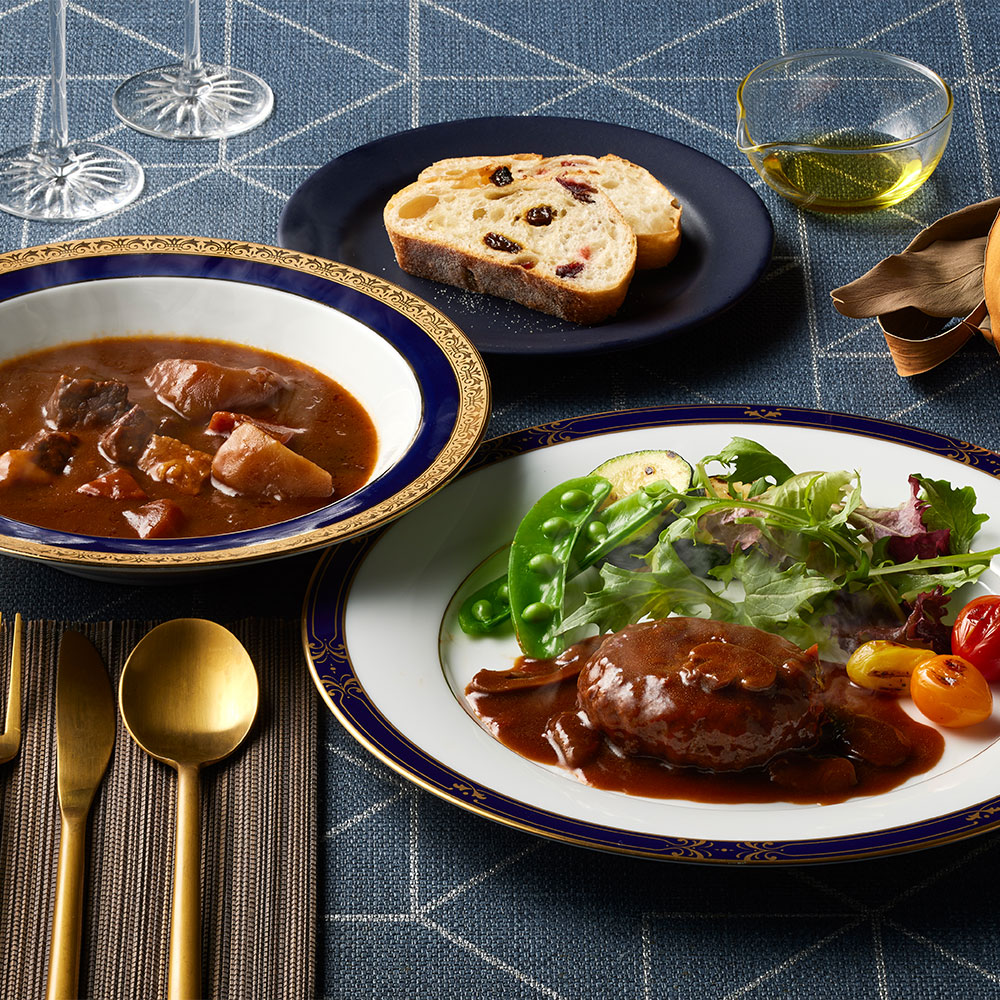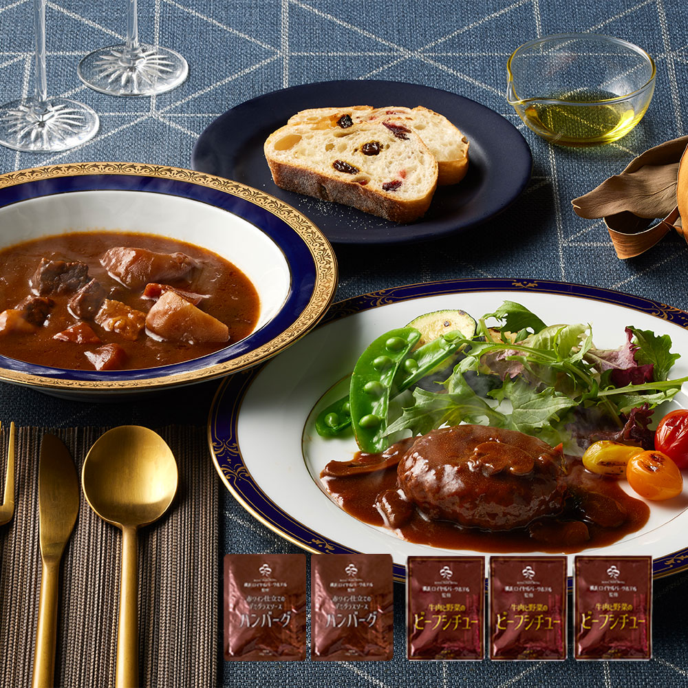 ソテーオニオンの旨味とトマトペーストの優しい酸味や赤ワインの風味が引き立てるソースに、大き目にカットした具材を合わせた奥深い味わいのビーフシチューと、コク・うま味・程よい酸味が調和されたデミグラスソースが特徴のハンバーグとのセットです。湯せんするだけで本格的な味をお楽しみいただけます。
