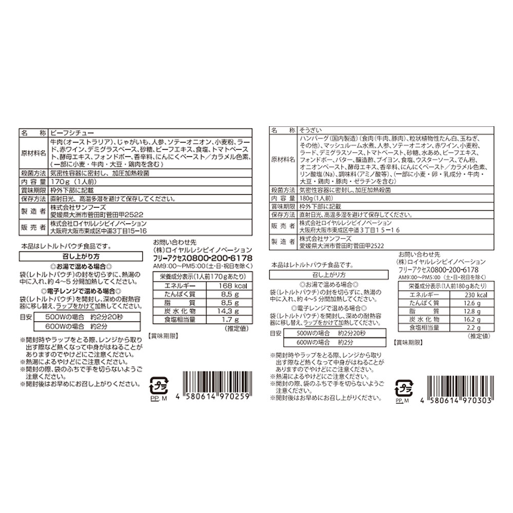 ■規格:牛肉と野菜のビーフシチュー170g×3、赤ワイン仕立てのデミグラスソースハンバーグ180g×2
