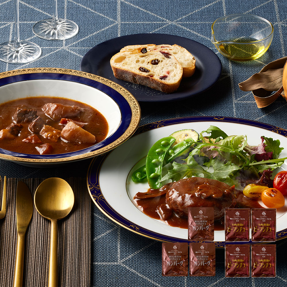 ソテーオニオンの旨味とトマトペーストの優しい酸味や赤ワインの風味が引き立てるソースに、大き目にカットした具材を合わせた奥深い味わいのビーフシチューと、コク・うま味・程よい酸味が調和されたデミグラスソースが特徴のハンバーグとのセットです。湯せんするだけで本格的な味をお楽しみいただけます。